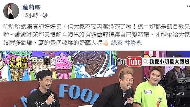 昨天(20日)蘿莉塔在臉書上緊急滅火,她表示「大家不要再罵綠茶了啦!這一切都是節目效果啦~。」蘿莉塔特地感謝綠茶那天很配合演出,沒有多做解釋讓自己成為箭靶,才能帶給大家這麼多歡樂,最後更強調「真的是個敬業的好藝人呢!」