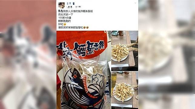 該名王姓女網友在臉書社團「氣炸鍋好好玩---食譜分享」發文和分享照片,她提到看到別人分享的氣炸鱈魚香絲,自己也來嘗試一下,設定「155度4分鐘!」隨後鱈魚香絲起鍋,王女形容口感「酥酥脆脆的,好吃!連我家的窯窯(貓咪)都搶著吃。」