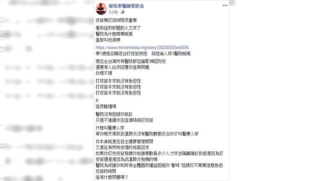 新冠肺炎(COVID-19)疫情在韓國延燒,中央流行疫情中心也將韓國旅遊疫情建議提升為第三級「警告」(Warning),2月25日、2月26日從韓國入境的本國人士需進行14天自主健康管理,怎料台南一名媽媽不配合此項規定,硬是要帶1歲多女兒施打疫苗遭3家大醫院拒絕,認為被當醫療人球,對此,婦產科醫師蘇怡寧忍不住開轟,「疫苗要打但時間很重要」、「直接叫他滾啊」。