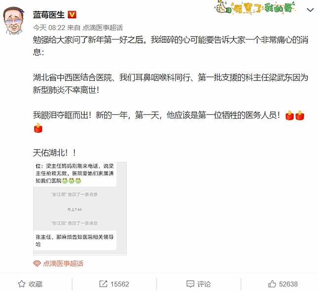 獲微博官方認證的醫療大V「@藍莓醫生」指出,1月25號早上9點12分,在湖北省的中西醫結合醫院的耳鼻喉科醫生梁武東,於1月25日早上7時許不幸去世,享年62歲,是第一位犧牲的醫務人員!