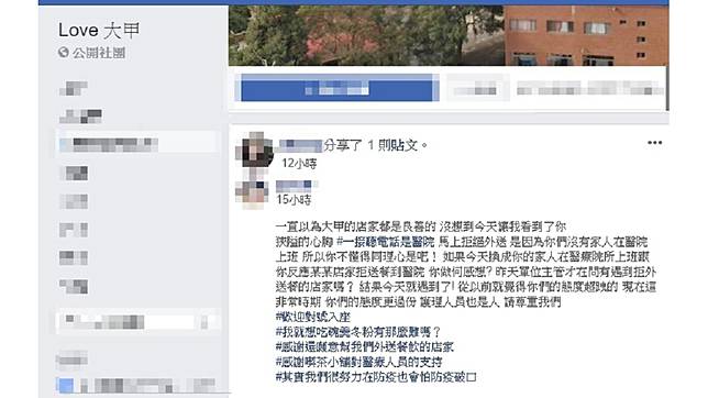 該名護理師的文章昨(3日)被轉載至「Love大甲」臉書公開社團,文章內容寫道,一直以為大甲的店家都是良善的,一聽到外送地點是醫院,馬上拒絕外送,直言,「你們沒有家人在醫院上班,所以你不懂同理心是吧?」