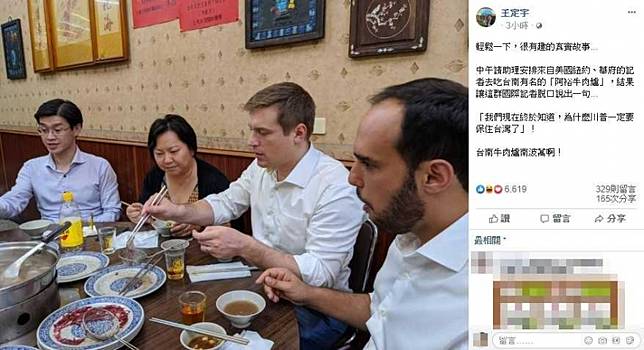 王定宇在臉書PO出一張與外媒記者用餐的照片,並表示他請助理安排,讓美國華府、紐約的外媒記者品嚐台南知名的「阿裕牛肉爐」。而這些記者吃到了這間稱霸全台的台南溫體牛肉後,驚艷不已,真心話忍不住脫口而出,「我們現在終於知道,為什麼川普一定要保住台灣了!」