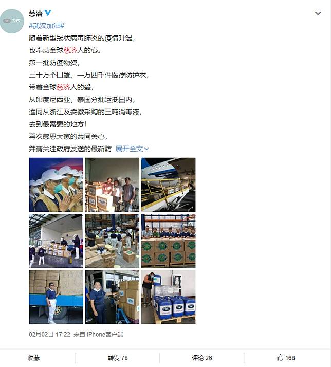 雖然致死率比SARS低,但武漢肺炎傳播率相當快速,爆發至今1個多月,已造成426人死亡,超越SARS當年在大陸的死亡人數,慈濟2日在微博發文,「隨著新型冠狀病毒肺炎的疫情升溫,也牽動全球慈濟人的心,第一批防疫物資,30萬個口罩、1萬4千件醫療防護衣,帶著全球慈濟人的愛,從印度尼西亞(印尼)、泰國分批運抵」、「連同從浙江及安徽採購的3噸消毒液,去到最需要的地方!」PO文最後也再次感恩外界的共同關心,並呼籲大眾關注政府發送的最新防疫訊息,「我們深信,在大家眾志成城、匯心聚力之下,疫情必能早日消除!祝福大家身心健康、日日平安!」