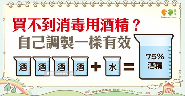 武漢肺炎造成人心惶惶,不僅口罩大幅缺貨,就連消毒用酒精也一瓶難求。衛生福利部提醒,若買不到75%消毒酒精,用95%酒精也可輕易調配出消毒用酒精!