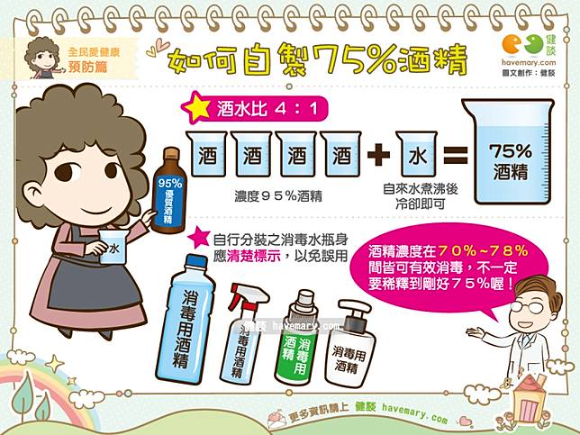 到底該如何調製消毒用酒精?根據衛福部資料指出,消毒用酒精並非一定要剛好是75%,只要酒精濃度介於70至78%之間都可達到消毒的作用!若手邊可購買到濃度95%的酒精時,只要以酒精4、純水1的比例調製,即可得到消毒用酒精。