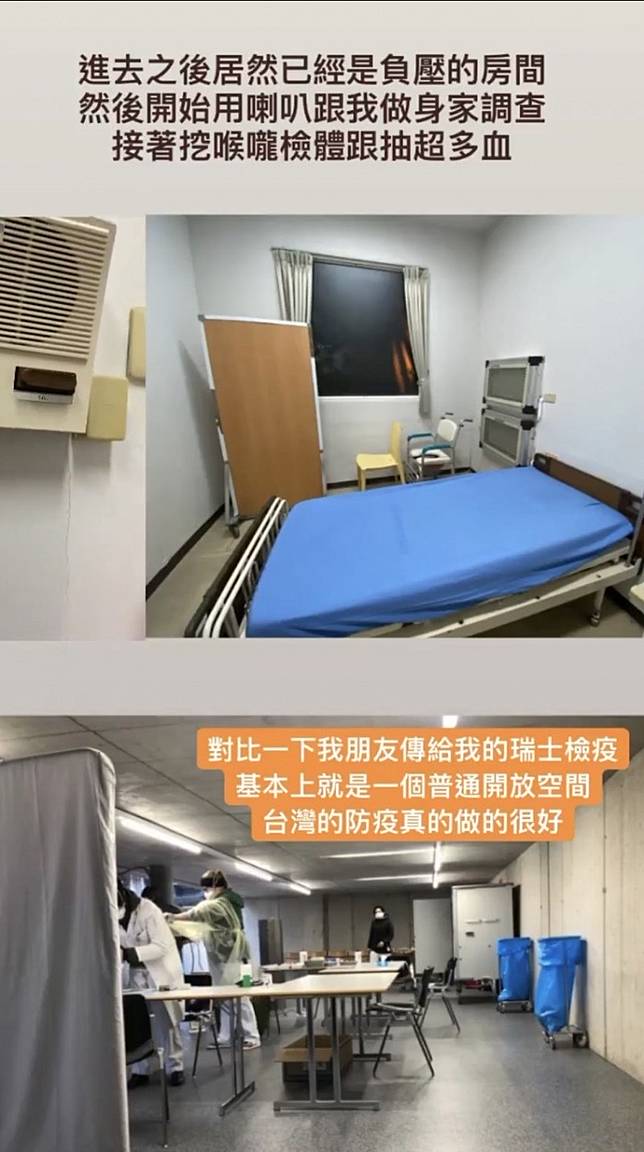 網友說,打從一開始,醫護人員及防護措施就相當嚴謹,對比他朋友傳來的瑞士檢疫站照片,「基本上就是一個普通開放空間」,令他不禁讚嘆台灣防疫真的做得很好。網友也心疼道,「每次看到護理師都覺得好疲憊」,這次經驗也讓他對醫護人員更加尊敬。