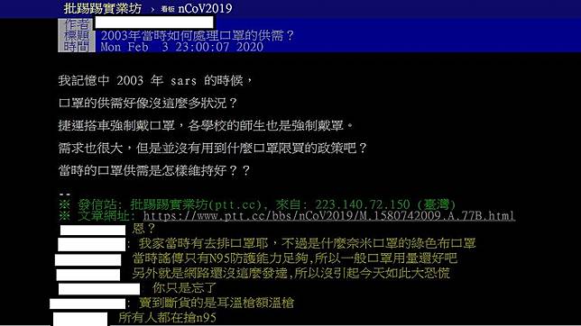 一名網友在PTT發文,表示自己印象中,2003年SARS爆發時,感覺口罩的需求也大,但好像不如現今狀況多「捷運搭車強制戴口罩,各學校的師生也是強制戴罩。需求也很大,但是並沒有用到什麼口罩限買的政策吧?當時的口罩供需是怎樣維持好?」