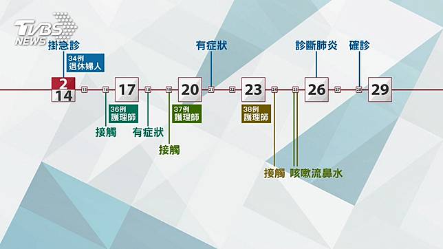 尚未找到感染源,也讓疫調工作更加嚴峻,因為疑似被第34例傳染的,還有三位護理人員,案36的護理師,在退休婦人入院後第三天,16日在一般病房接觸,18日有呼吸道症狀,案37跟38兩位護理師,分別在19日跟24日,與確診婦人接觸後,雙雙在25日出現咳嗽、流鼻水,三位護理師與清潔工,都是29日被確診。