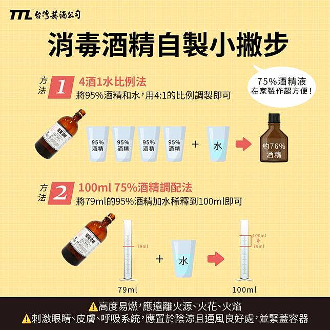另外95%的酒精怎麼變成消毒酒精,台酒也提供兩個小撇步。