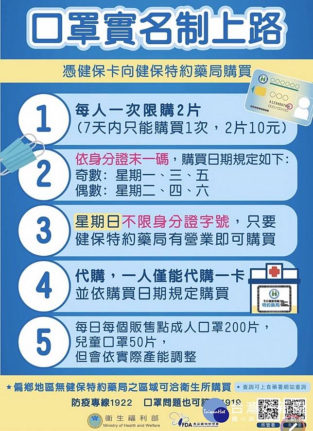 中央流行疫情指揮中心公布,中國大陸新型冠狀病毒肺炎疫情持續升溫,全球掀起搶購口罩亂象,為遏止國人搶購、囤積口罩的風潮,宣布口罩販售實名制2月6日上路,希望讓更多有需要的民眾買得到口罩,並讓資源利用公平及透明。