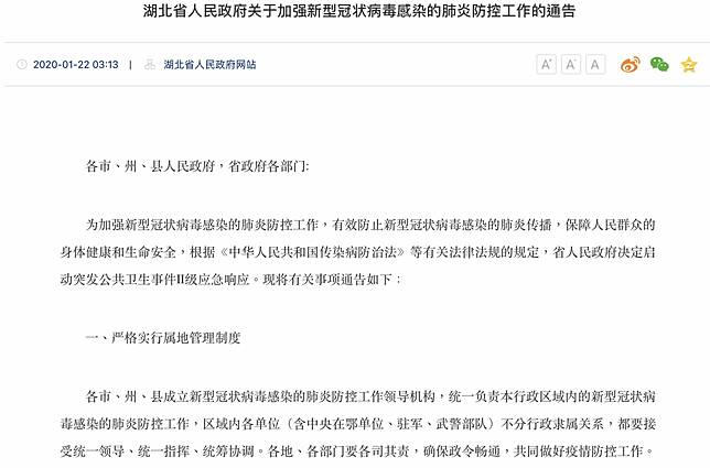 陸方公告防疫措施 圖片來源:湖北省健康委員會