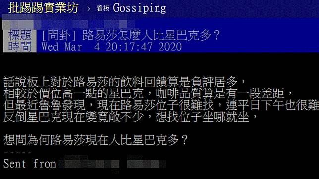 原PO日前在PTT表示,「話說版上對於路易莎的飲料回饋算是負評居多,相較於價位高一點的星巴克,咖啡品質算是有一段差距,但最近卻發現,現在路易莎位子很難找,連平日下午也很難找,反倒星巴克現在變寬敞不少,想找位子坐哪就坐。」讓他不禁感到納悶,「想問為何路易莎現在人比星巴克多?」