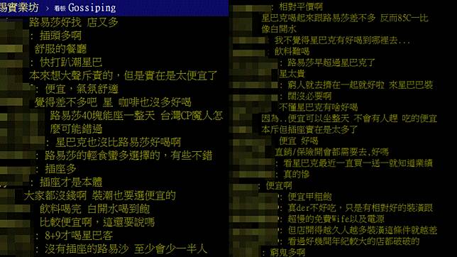 許多網友點出路易莎的優點,「路易莎好找,店又多」、「便宜,氣氛舒適」、「插頭多啊」、「插座才是本體」、「本斥但插座實在是太多了」、「便宜呷粗飽」、「咖啡不錯喝又便宜」、「價格差4、5倍啊」、「不是每個客人都有錢可以喝星巴克」、「路易莎的輕食蠻多選擇的,有些不錯」、「沒有插座的路易莎,至少會少一半人」。