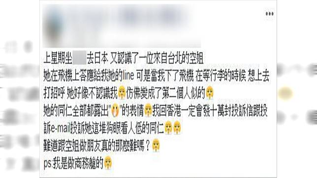 香港一名網友先前搭飛機前往日本時,在飛機上認識一名來自台北的空服員,當下他向對方要了聯絡方式,不過下飛機後這名空服員卻裝不認識,使他覺得自己遭到拒絕,事後忍不住發文還原整起事發過程,同時還怒批「一定會發10萬封投訴信」,不料卻慘遭網友瘋狂砲轟。