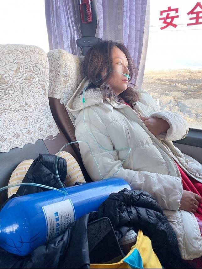 王瑞霞回憶當下:「雙眼是矇的、心跳加速、頭痛發作、臉色發白,完全喘不過氣。」幸好導遊立刻在車上施行急救措施,王瑞霞吸了純氧長達10分鍾才恢復清醒,臉上氣色逐漸恢復紅潤。