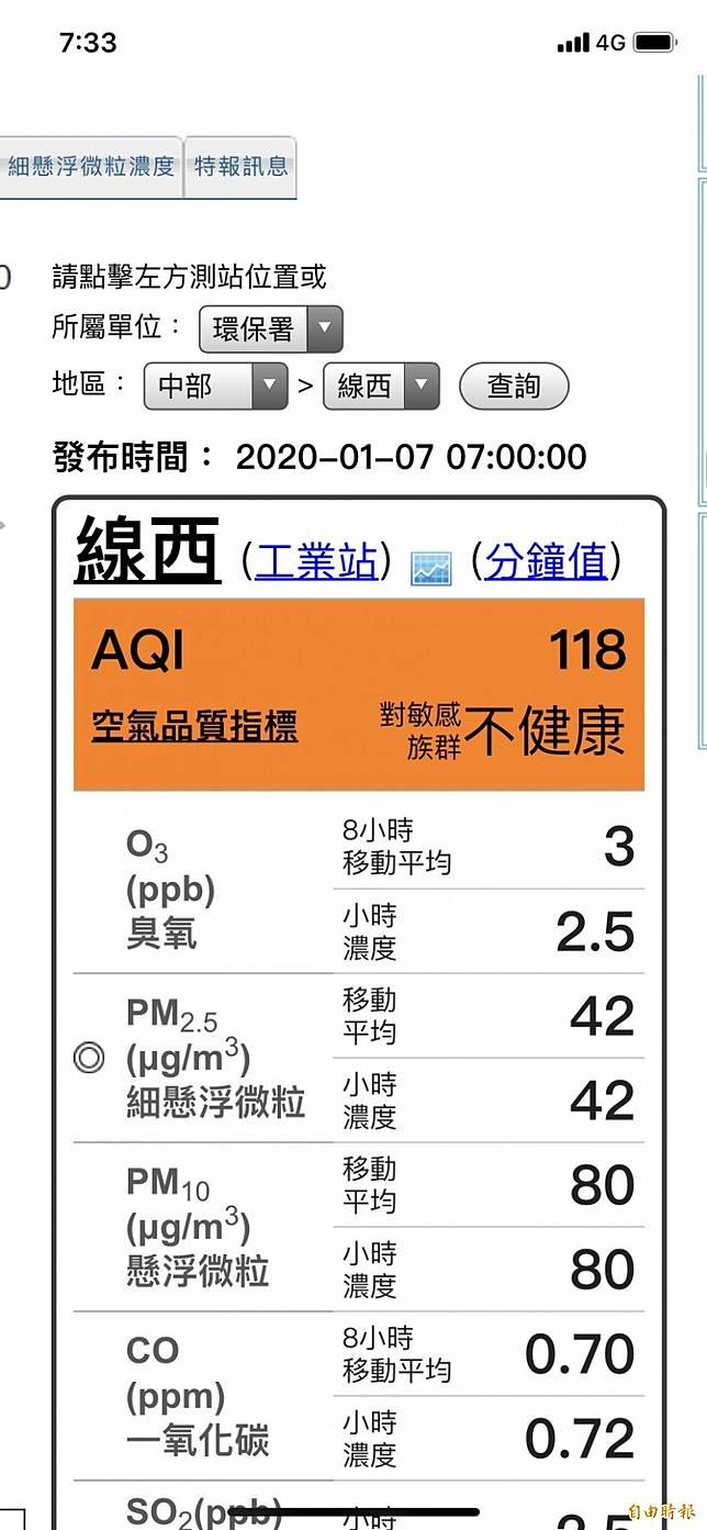 〔記者張聰秋/彰化報導〕橘色警戒!今日(7)全台環境風場為東南風,受地形影響西半部擴散條件很差,空氣中污染物累積多,中部地區空氣很髒,彰化縣4個空氣品質監測站,今天一早即時空氣品質指標AQI全都高達110,已經進入對敏感族群不健康的橘色警訊,戶外一片灰濛濛,視線不良,宛如「霧城」,環保局提醒民眾應減少外出,必要外出請做好自身健康防護。