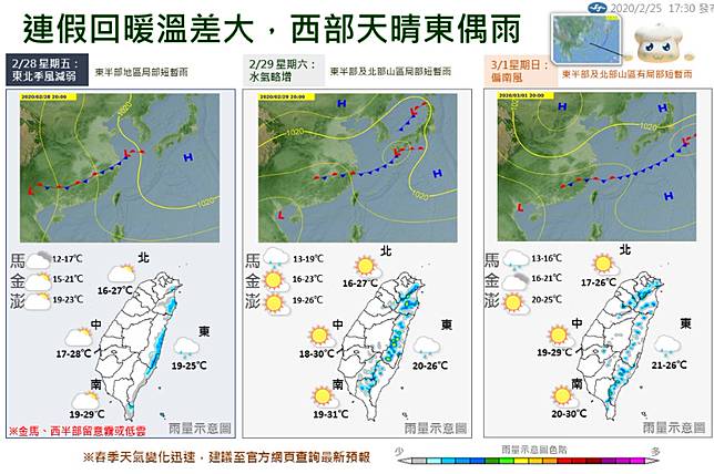 另方面,週五至下週一(28日至3月2日),西半部地區及金門、馬祖易有局部霧或低雲影響能見度,尤其清晨機率更高一些,交通往返請多留意;週五東半部(含綠島、蘭嶼)及恆春半島沿海有長浪發生的機率,海邊活動請注意安全。