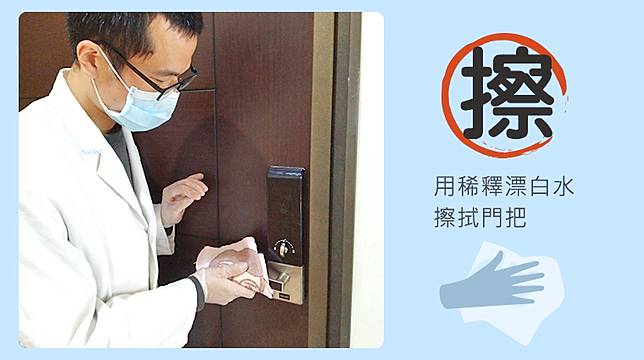 ▲「擦」:用稀釋漂白水擦拭門把、玩具、電話機、桌椅、櫥櫃、廚房流理台、水龍頭等。