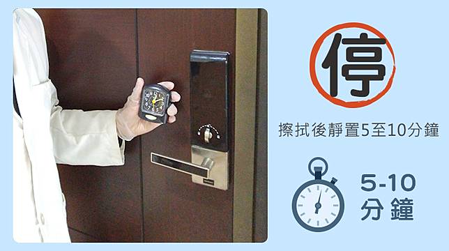 ▲「停」:擦拭後,靜置5至10分鐘,等待漂白水確實發揮殺菌功效。