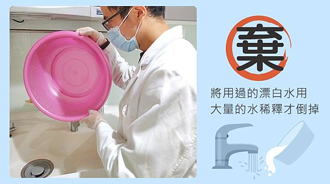 ▲「棄」:將用過的漂白水再用大量的水稀釋1遍(不要少於100倍)才倒入廚房污水道或戶外水溝,比較不會污染水源。