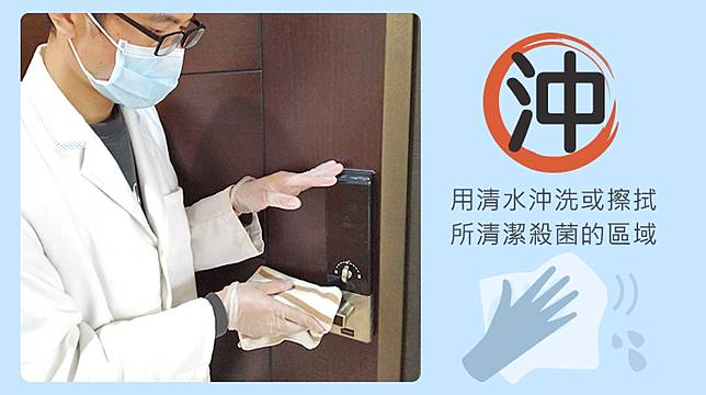 ▲「沖」:用清水沖洗或擦拭所清潔殺菌的區域。