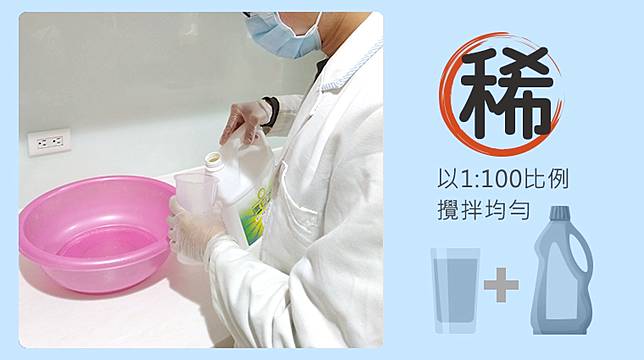 ▲「稀」:市售漂白水濃度約5%,以1:100比例攪拌均勻即可。