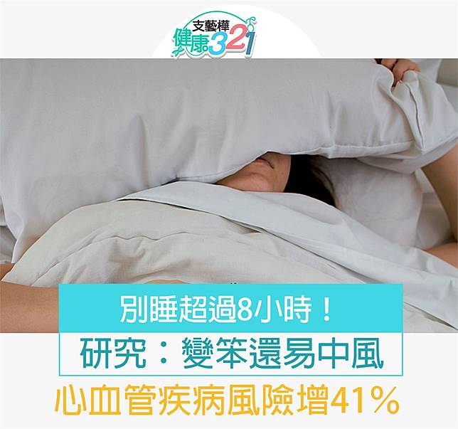 北京協合醫院研究團隊大規模的研究發現,睡覺時間超過8小時,中風、心臟衰竭等重大心血管疾病,比睡不到8小時的人高出41%!國際《神經科學期刊》也指出,每天睡超過9小時,罹患老人痴呆的風險是一般人的2倍!新光醫院心臟內科醫師邱俊仁說,過度睡眠會連帶使身體運動量太少,自然會增加心血管疾病發生的機率。