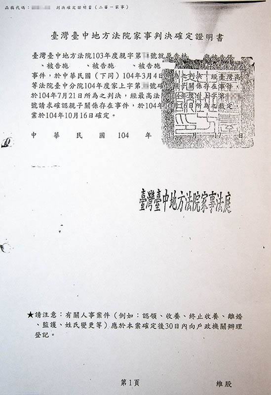 法院認證的親子關係確認,證明QQ確實是施家金和林女所生。(圖/讀者提供)