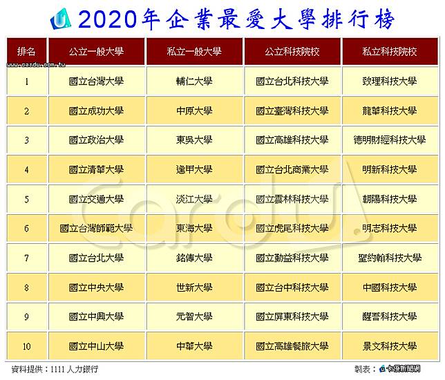 今(2020)年大學學測報考人數只剩下13.3萬人,許多大學面臨「關門」壓力,但也有眾多大學聲望持續攀高。1111人力銀行最新企業最愛大學排行榜顯示,雇主最滿意的公立大學由台大、成大蟬聯冠亞軍;私立大學中輔大重回第1,中原以些微票數差距緊追在後;公立技職院校仍由北科大掄元,台科大居次;私立技職院校以致理科技大學獲得榜首,而後依序是龍華、德明、明新。