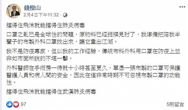 外科醫師錢橙山,近日在臉書以「擋得住飛沫就能擋得住肺炎病毒」為題發文,他表示,口罩之亂已是全球性的問題,原物料已經捉襟見肘了,「我準備把陪我半輩子的布製外科口罩找出來,讓它重出江湖。」