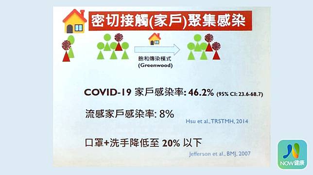 ▲COVID-19(新型冠狀病毒、武漢肺炎)家庭感染率(密切接觸)約46.2%,如果家裡有高風險者,戴上口罩加上勤洗手,感染率能降低至20%以下。(資料來源/台灣大學公衛學院副院長陳秀熙;攝影/陳敬哲)