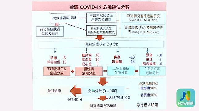 陳秀熙強調,分析中國大陸武漢病毒與台灣流感相關數據資料,民眾或醫療單位就可以先行判斷對武漢肺炎的危險評估。沒有發燒的狀態下,基礎分數50分;有下呼吸道症狀或慢性病,如咳嗽、呼吸急促、糖尿病,分數往上加;有上呼吸道與全身性症狀則往下扣分,如鼻塞、喉嚨痛、肌肉痠痛等(類似流感症狀);危險分數大於與等於40分,就須要採檢確認有無感染武漢肺炎。