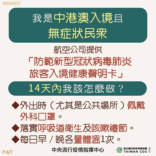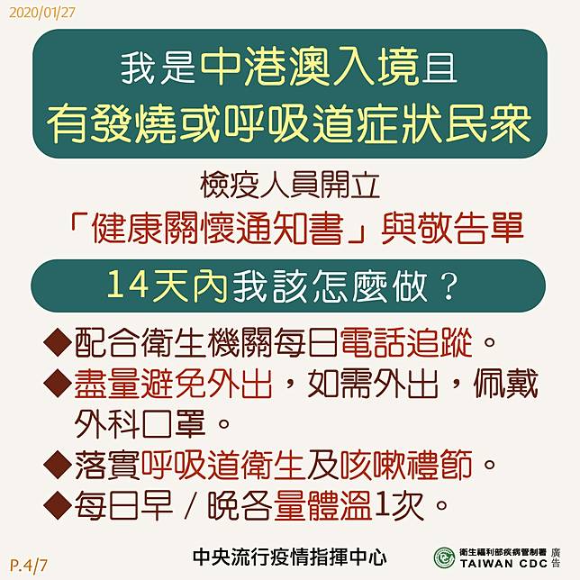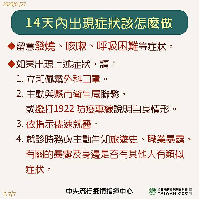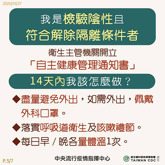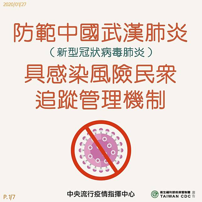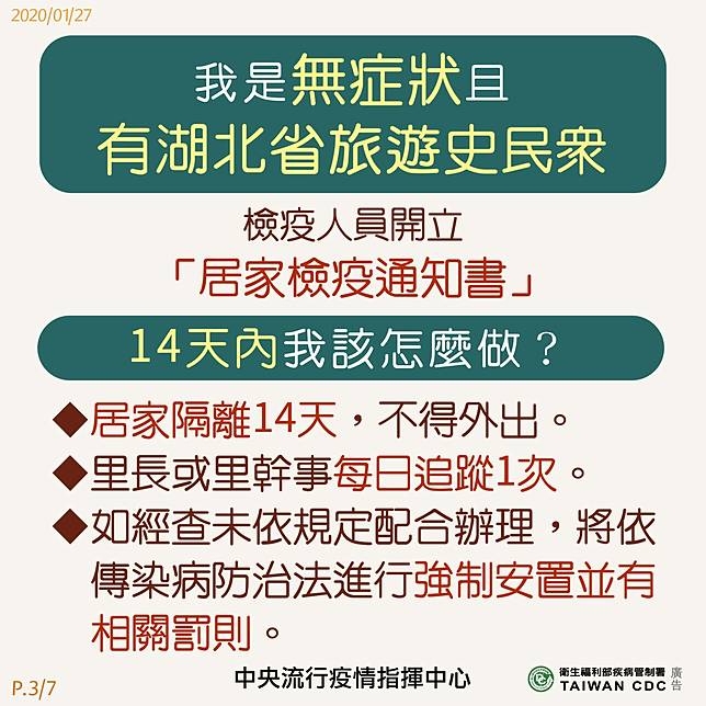 一、全面禁止湖北省居民來台,從湖北返台的民眾要進行14天居家隔離