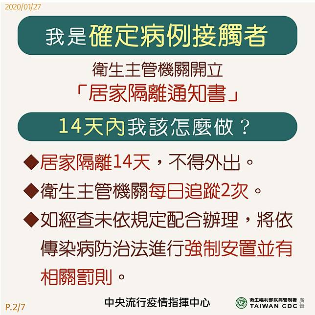 2019新型冠狀病毒(2019-nCoV),俗稱武漢肺炎的確診案例越來越多,再加上有一名台商從武漢回來台灣後隱匿通報,中央流行疫情指揮中心不斷升高隔離的管制措施;即日起,從湖北返台的人都要進行14天的居家隔離,否則進行強制隔離。