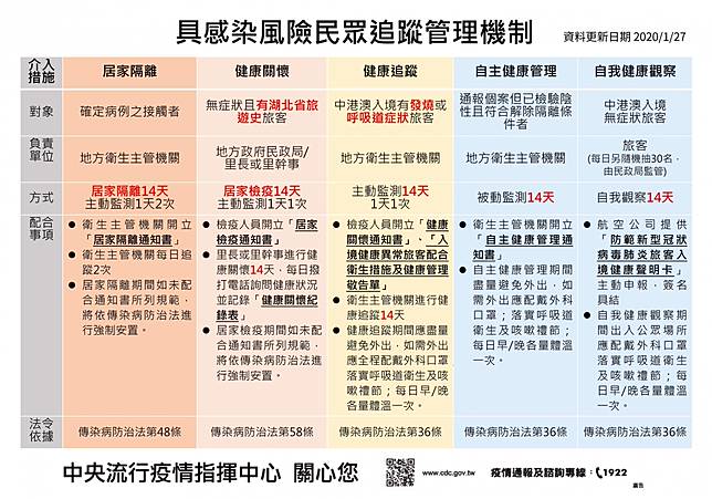 衛福部長陳時中表示,自26日起,全面禁止湖北居民來台灣,而從湖北省返台,或是跟確診個案有接觸的人,都必須進行居家隔離14天,每天會有相關人員打電話詢問健康狀況,違者將強制隔離。