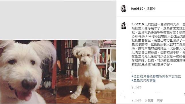 梁敏婷在貼文中表示,以前曾救過一隻狗狗叫「大叔」,雖然牠當天使好幾年了,但還是會常常想起牠。梁敏婷感嘆,「大多數人可以決定自己的命運,但動物卻不能,希望星星元元以後也可以像父母一樣的去愛和保護小動物,可以的話順便幫家裡的動物洗澡梳毛就更好了。」