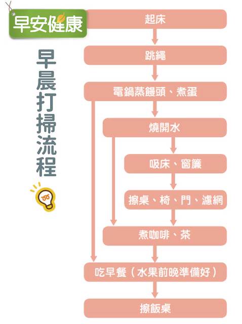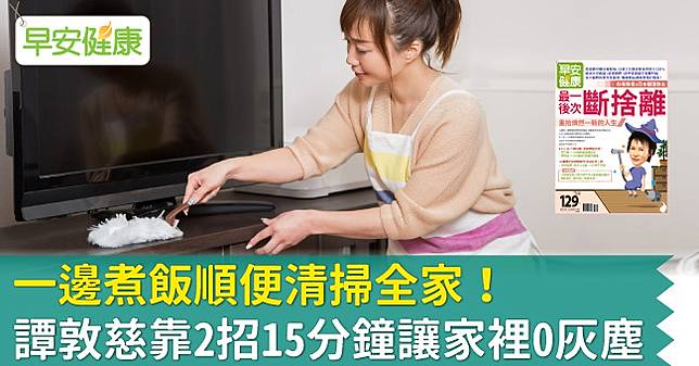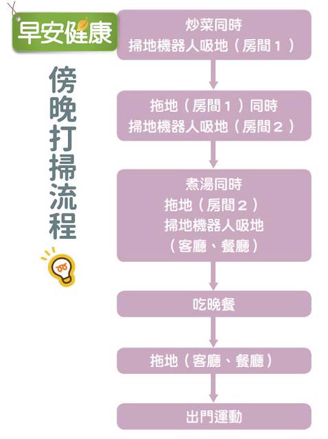 【早安健康編輯部】從早晨與晚間打掃的流程,就可以看出來,林口長庚醫院護理師譚敦慈利用零碎的時間,將家事集中在一起做,例如準備早、晚餐的時間,往往都是不可避免的,就以準備早、晚餐的時間為骨幹,在中間的空檔、等待的時間,去做其他可以分段做、容易完成的家事,而不是先準備完餐點,再去掃地拖地,一件一件來,整體花費時間較長。