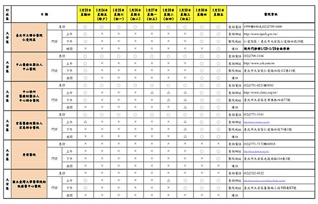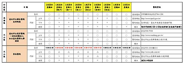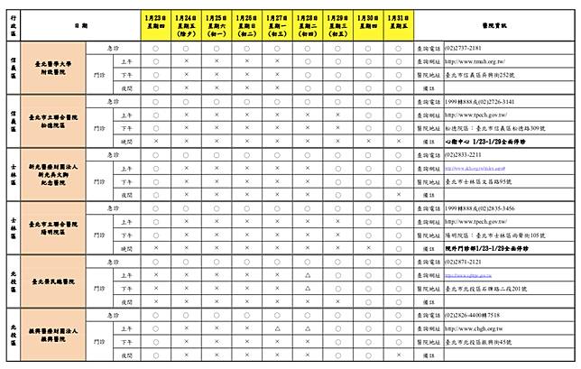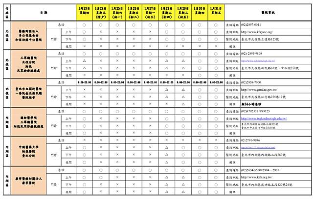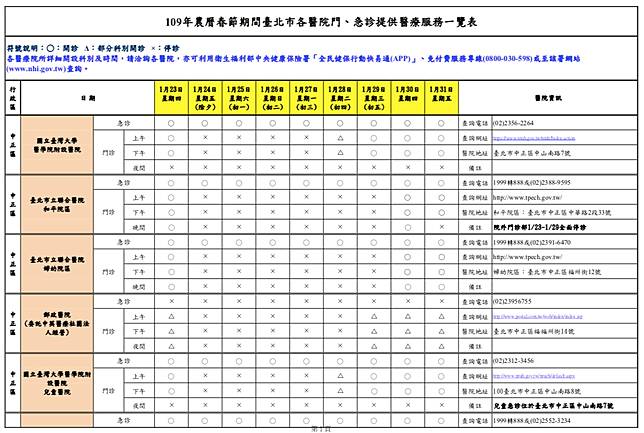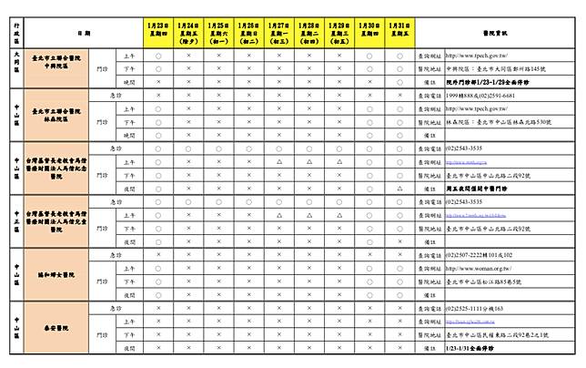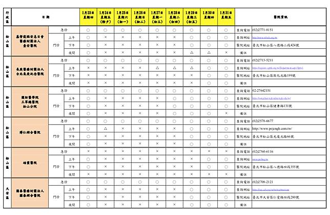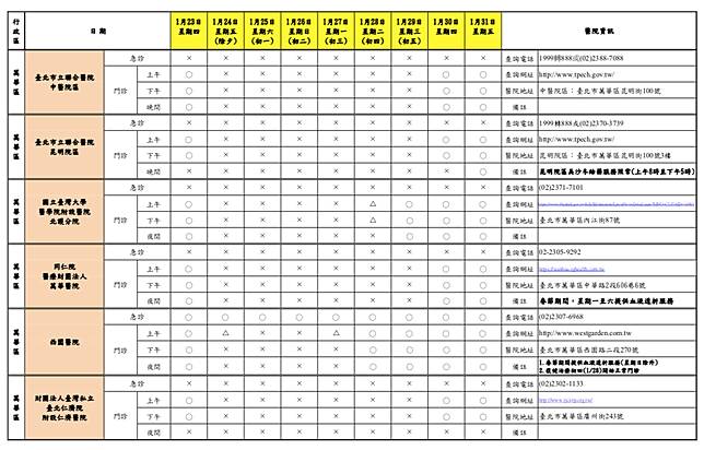 台北市衛生局統計,台北市今年春節假期期間「急診」有23家醫院24小時開設;「門診」各醫院均有調整開設診次,多數醫院於1月24日(除夕,星期五)至1月29日(年初五,星期三)停止門診服務或僅提供部分門診, 1月30日(年初六,星期四)後逐步恢復正常開診,請民眾就醫前務必留意醫院開診情形。