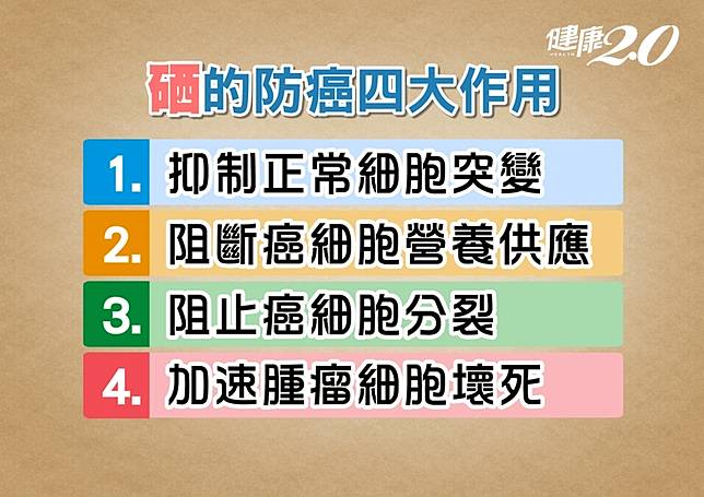 抗癌、防癌是現代人最關注的健康議題之一,敏盛醫院研究副院長江坤俊表示,在正常細胞變成癌細胞的過程中,硒可說是相當強大的防衛軍,因此適量補充硒、增加體內硒濃度是相當重要的。
