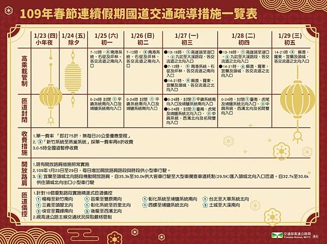 高公局表示,今天南向國1楊梅─新竹系統、彰化系統─埔鹽系統、國3土城─關西、快官─霧峰、草屯─名間、國5南港系統─坪林,以及北向國1西螺─埔鹽系統、南屯─后里、新竹─湖口、國3竹山─中興、草屯─霧峰、沙鹿─大甲、大山─香山、關西─大溪、國5宜蘭─坪林等路段都可能出現車多壅塞現象,建議南向用路人下午出發,北向用路人上午出發。