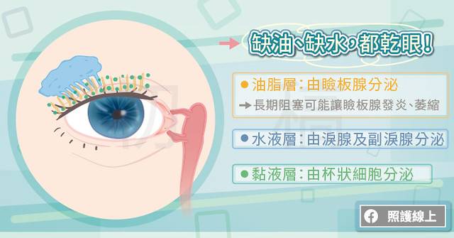 缺油型:若瞼板腺阻塞、萎縮,導致油脂分泌異常,淚液缺少油脂層,而使水分快速蒸發。瞼板腺是長條形線體,開口在睫毛根部附近,其分泌的油脂一般會在眨眼時排出並分布於淚液表層。正常時候,我們的眼睛每分鐘會眨15~20次,但當我們緊盯螢幕、手機時,眨眼頻率不自覺地下降,影響油脂的排出。瞼板腺開口阻塞,可能導致瞼板腺發炎、萎縮,乾眼症狀會愈來愈嚴重。