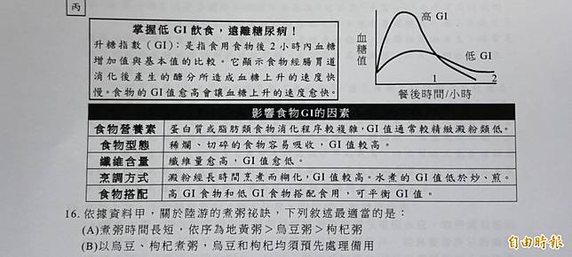 〔記者林曉雲/台北報導〕大學學測第二節國文科,題組考出愛吃粥的詩人陸游為什麼患有糖尿病和牙周病,題幹除了有陸游粥品的私房筆記烏豆粥、地黃粥、枸杞粥,還給升糖指數(GI)的圖表分析和食物GI因子,古文和白話文摻雜,從現代營養學角度幫陸游診脈;另也考出電影駭客任務題,乍看是電影駭客任務,但其實考題引用《當經濟指標統治我們》文章改寫,虛實互見也考驗學生的理解力,老師們都肯定出題精彩。