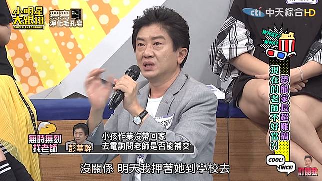 彭華幹近日上《小明星大跟班》節目分享,有次女兒找英文作文作業,找了10分鐘都找不到,後來發現根本忘記帶回家,他罵完小孩一頓後,接著在凌晨1點多用Line打電話給老師,「我說老師我跟你講,現在英文作文找不到了,沒關係,明天我押著她到學校去,在你面前把英文作文寫完才准她下課。」