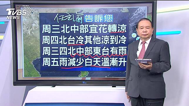 周三溫降北中部宜花轉涼;周四溫再降北台冷,其他早晚涼到冷;周三四北中部,東台有雨,周五雨減少,白天氣溫升,周六再升,白天漸熱。