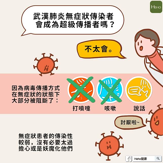 我們習慣以症狀判斷一個人有沒有生病,下意識地遠離咳嗽的、發燒的,那些看起來有「症狀」的人以免自己被波及。因此,當一個無症狀的武漢肺炎感染者出現,便頓時引起了一些恐慌,人們恐懼那些看不見、又致命的病毒,恐懼無法辨認那些「好像有問題」的人。甚至有人聯想出新的恐怖的可能性,像是同時身為無症狀感染者與超級傳播者的狀況出現。實際上是什麼狀況呢?無症狀感染者這麼恐怖嗎?一起來看看吧。