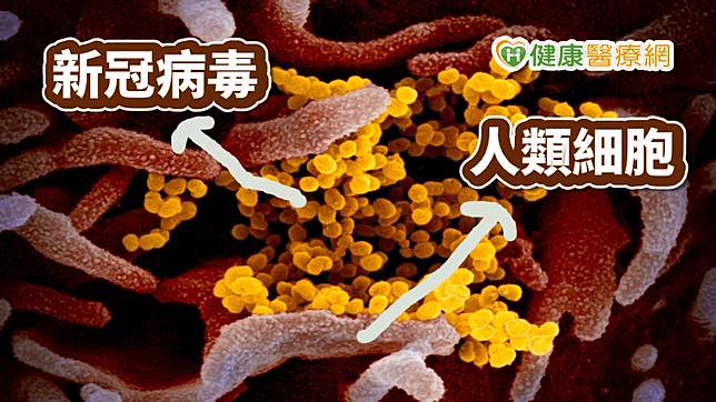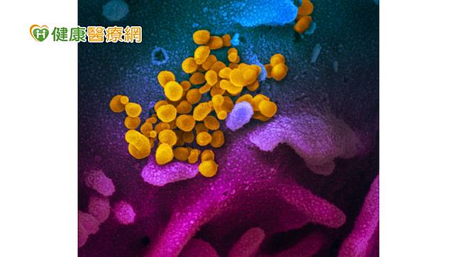 【插圖說:這張掃描式電子顯微鏡圖像顯示了新型冠狀病毒(黃色),從細胞(藍色/粉紅色)表面出現。Credit: NIAID-RML】