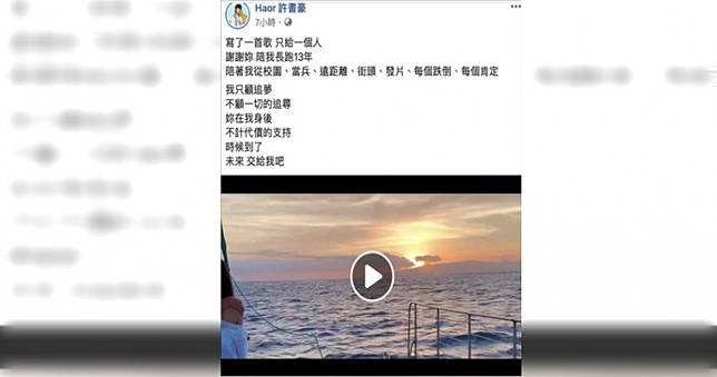 他今早在臉書Po文中說:「寫了一首歌,只給一個人,謝謝妳,陪我長跑13年,陪著我從校園、當兵、遠距離、街頭、發片、每個跌倒、每個肯定,我只顧追夢,不顧一切的追尋,妳在我身後,不計代價的支持,時候到了,未來交給我吧!」仔細的回顧和女友交往的日子裡,同甘共苦的點點滴滴。