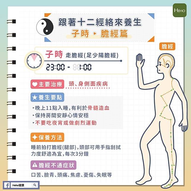 子時(晚上23時至清晨1時):走膽經 ( 足少陽膽經 ),主要治療、調理頭、身側面疾病。