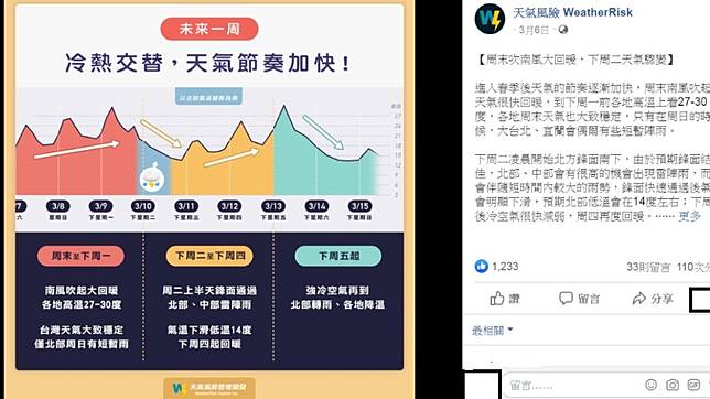 臉書「天氣風險 WeatherRisk」指出,週二(10日)凌晨開始北方鋒面南下,由於預期鋒面結構佳,北部、中部會有很高的機會出現雷陣雨,而且會伴隨短時間內較大的雨勢,鋒面快速通過後氣溫會明顯下滑,預期北部低溫會在14度左右;週三後冷空氣很快減弱,週四(12日)再度回暖;不過緊接著週五(13日)會有另一波更強的冷空氣報到,各地再度降溫、北部轉雨。