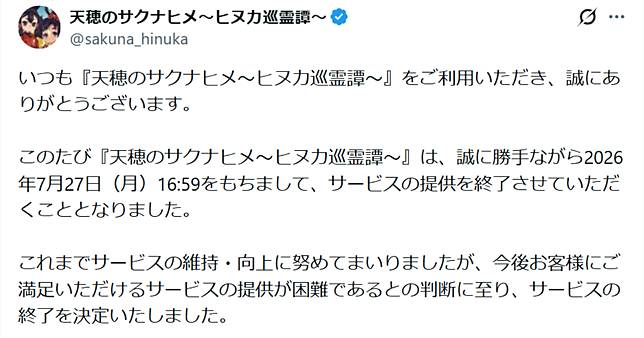 このたび『天穂のサクナヒメ~ヒヌカ巡霊譚~』は、誠に勝手ながら2026年7月27日(月)16:59をもちまして、サービスの提供を終了させていただくこととなりました。…